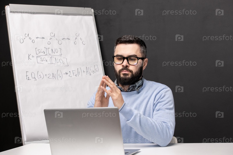 Молодая серьезная студентка в очках и повседневной одежде сидит перед ноутбуком