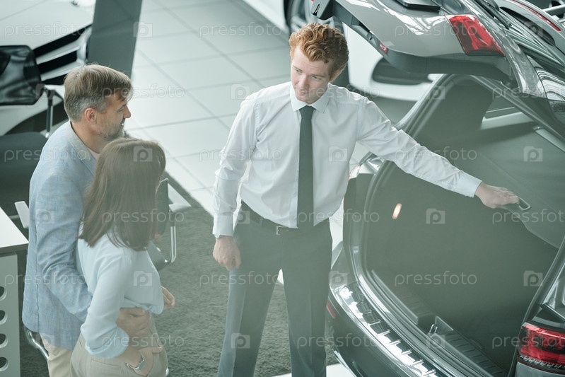 Молодой менеджер по продажам показывает своим клиентам все возможности новой модели