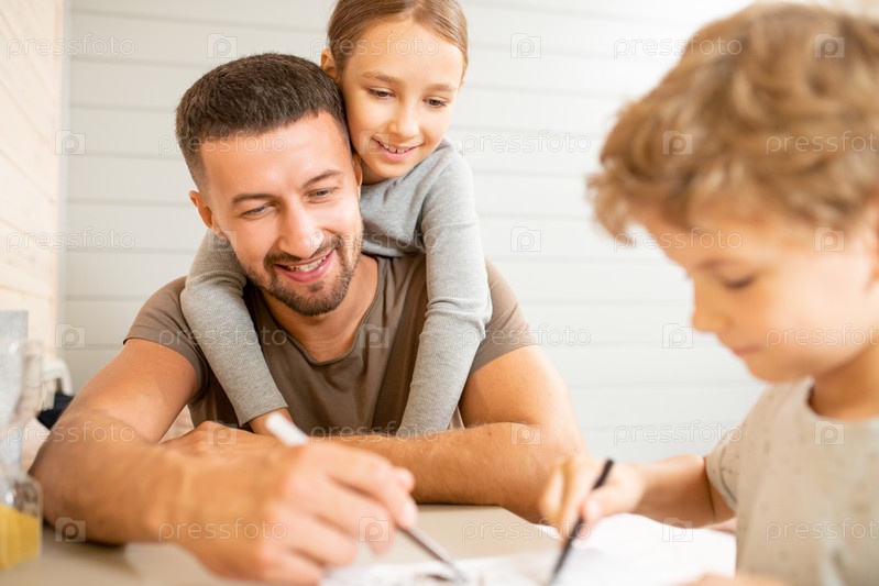 Счастливая милая маленькая девочка обнимает своего веселого отца, сидящего рядом с очаровательным сыном