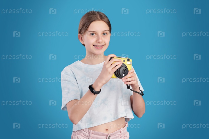 Улыбающаяся обычная девочка-подросток с фотоаппаратом собирается что-то снимать