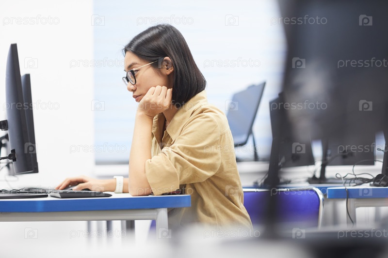 Молодая женщина использует компьютер в колледже Азиатский