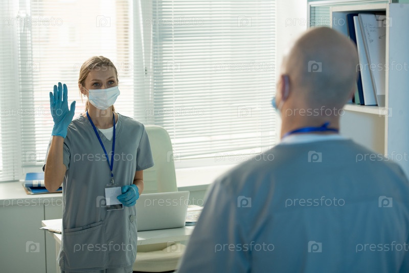 Работница медицинской лаборатории в защитной рабочей одежде машет рукой коллеге