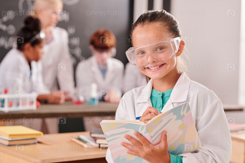 Веселая школьница в белом халате и очках смотрит на тебя с зубчатой улыбкой