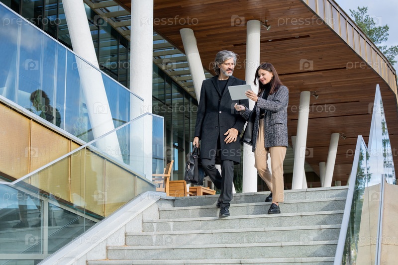 Молодая современная бизнесвумен с планшетом, показывающей онлайн-данные зрелому мужчине