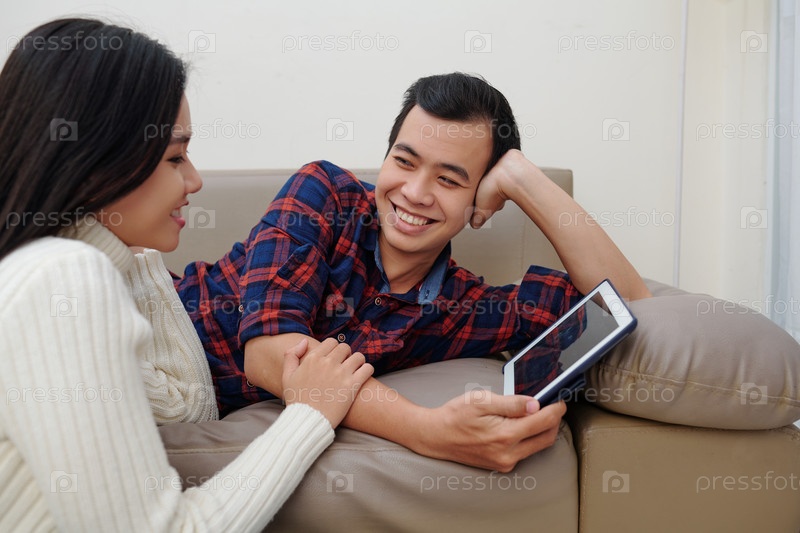 Пара смотрит шоу на планшетном компьютере