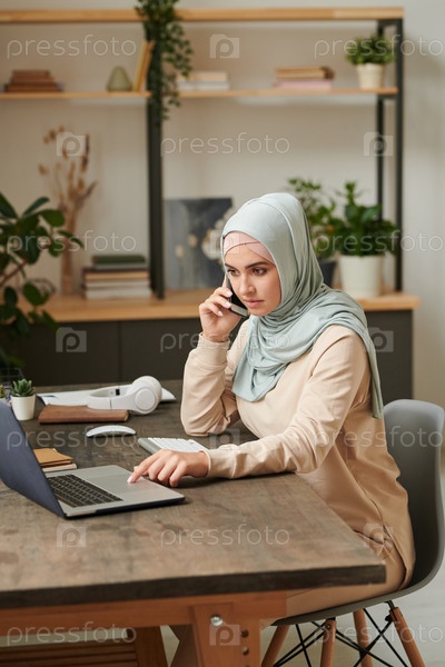 Серьезная молодая женщина в светло-синем хиджабе, сидящая за столом и обсуждающая важные вопросы по телефону во время работы над своим ноутбуком
