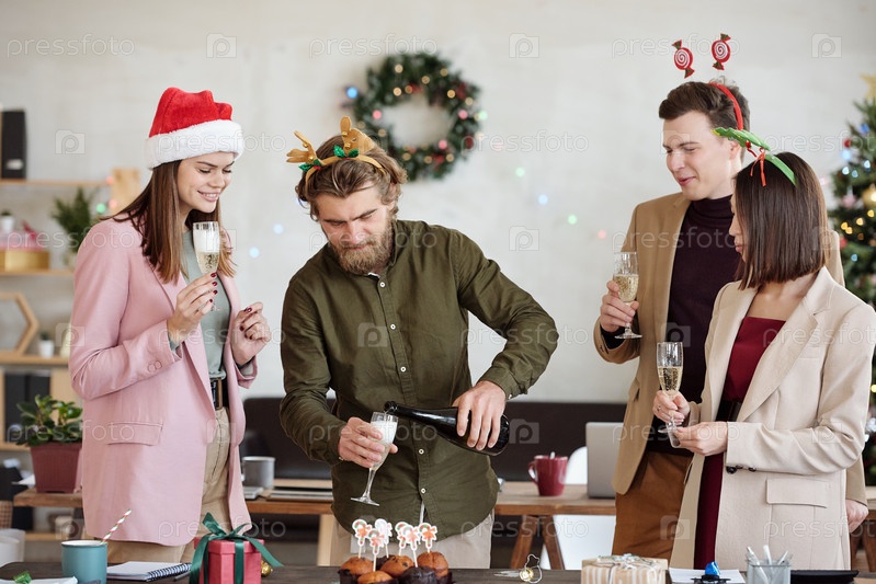 Бородатый бизнесмен наливает шампанское в флейты коллег на вечеринке