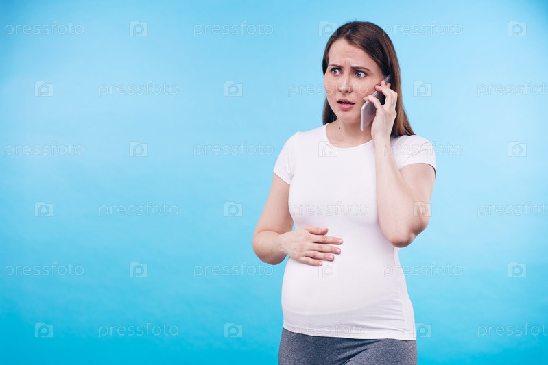 Молодая беременная женщина разговаривает по мобильному телефону о чем-то страшном