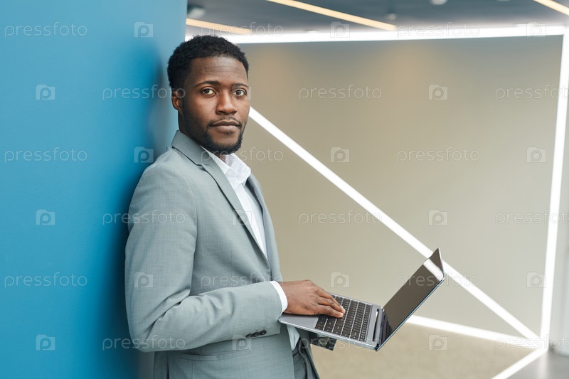 Успешный африканский бизнесмен держит ноутбук