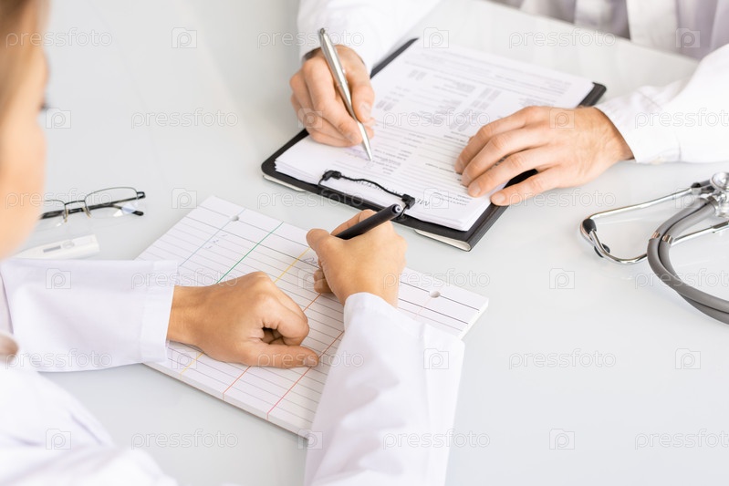 Руки женщины-клинициста с ручкой, заполняющей пустые карточки перед коллегой