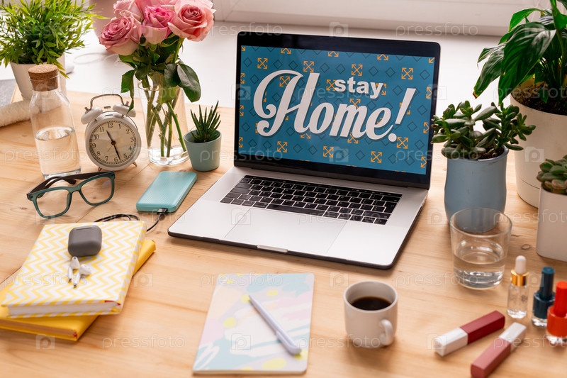 Рабочий стол оставаться дома на дисплее ноутбука, окруженный цветами и другими вещами