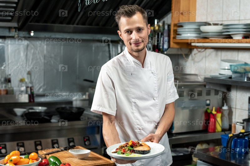 Счастливый молодой профессиональный шеф-повар в белой форме, держащий тарелку с жареным лососем