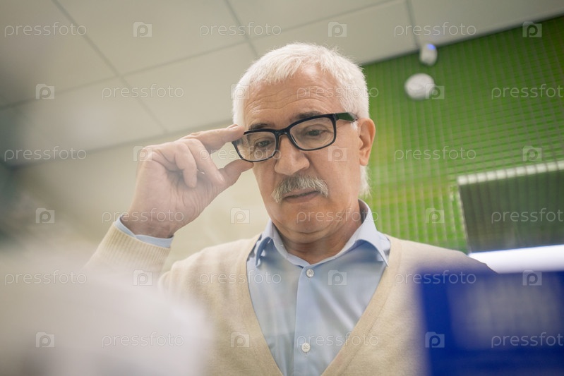 Пожилой мужчина с седыми волосами касается очков, стоя у большого дисплея