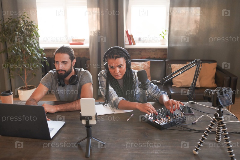 Горизонтальный портретный снимок двух мультиэтнических мужчин и женщин-блогеров, готовящихся к прямой трансляции с коррекцией технических настроек