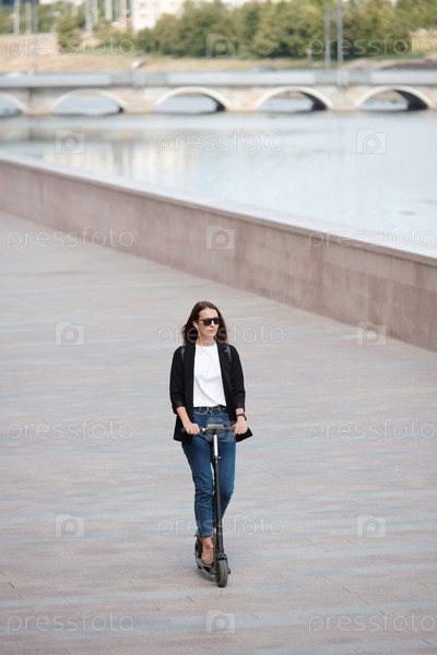 Молодая женщина в повседневной одежде и солнцезащитных очках движется на скутере вдоль берега реки