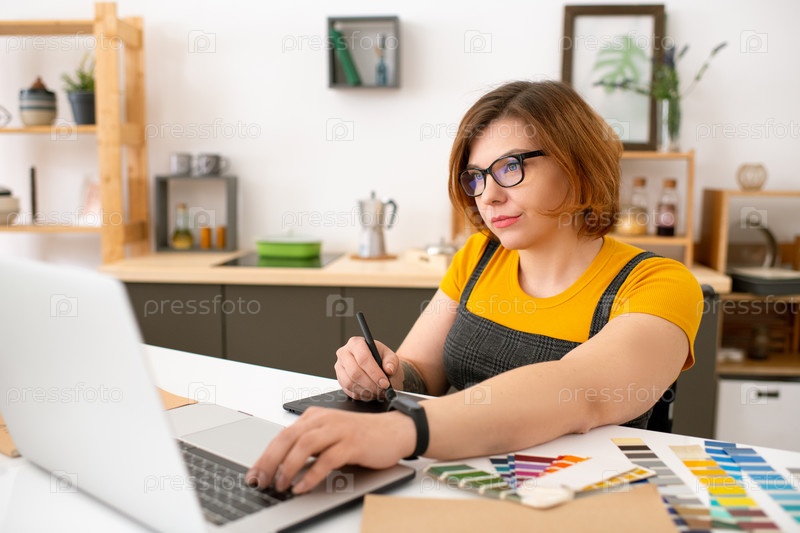 Молодой довольно уверенный в себе дизайнер смотрит на дисплей ноутбука, рисуя эскиз