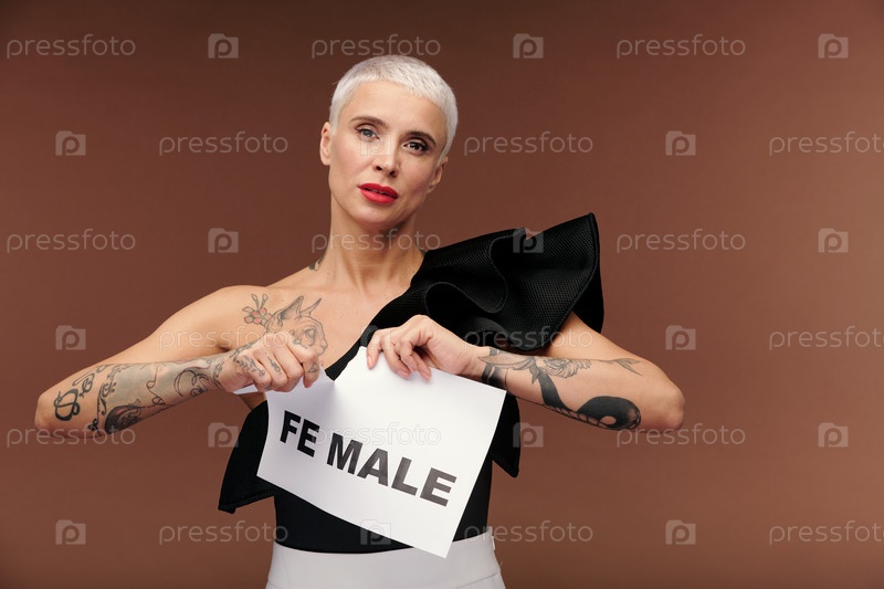 Блондинка в черной танковой бумажке с слоганом fe и словом male