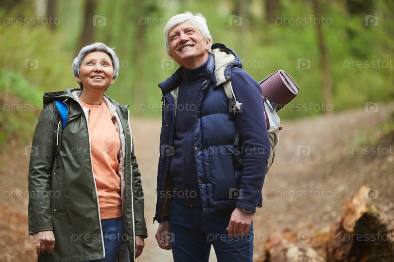 Современная старшая пара наслаждается прогулкой по лесу