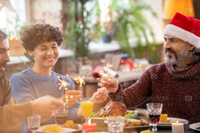 Два счастливых мужчины и молодая женщина, держащие бенгальские огни за подаваемым праздничным столом
