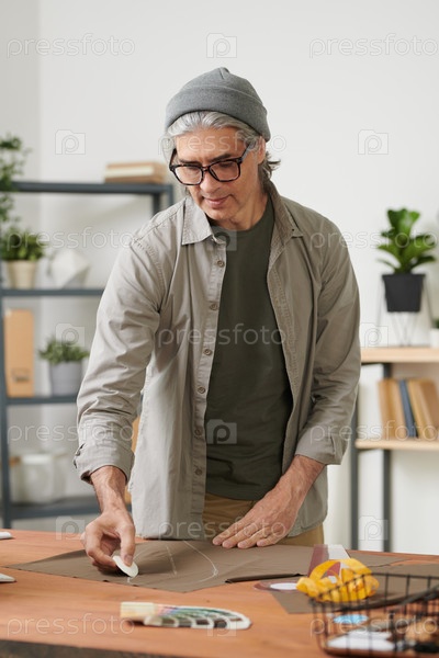Концентрированный хипстер, зрелый мужчина в шапочке, стоящий за рабочим столом и рисующий линию мелкой кредой во время подготовки ткани к пошиву в домашней студии