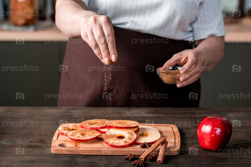 Руки домохозяйки кладут кусочки красных яблок на поднос домашнего фруктосушителя