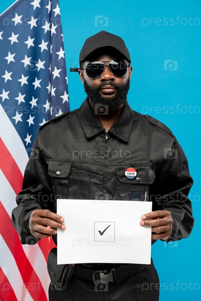 Африканские вещи безопасности в черной форме и солнцезащитных очках, держащие бюллетень