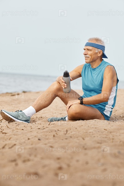 Спортивный старший мужчина отдыхает с бутылкой воды