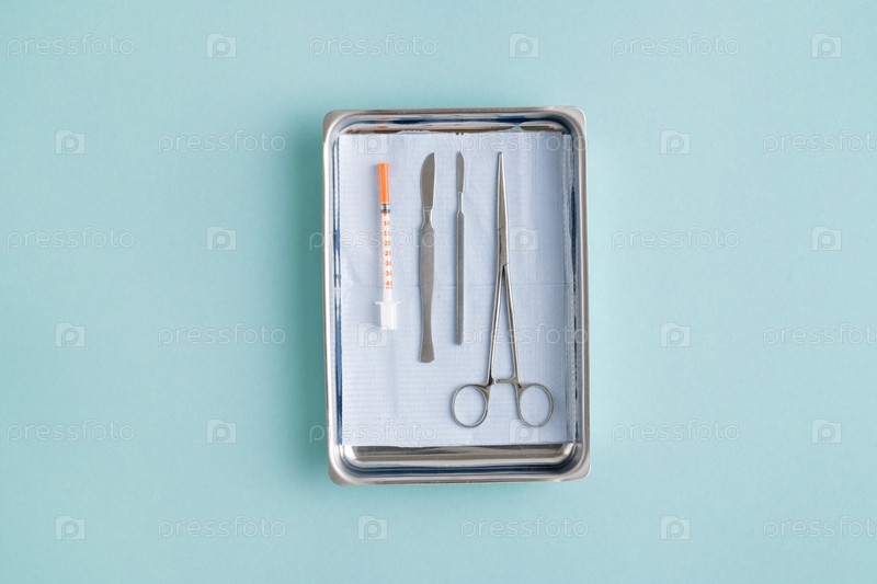 Flatlay медицинской чаши с хирургическими инструментами и шприцем для инъекций