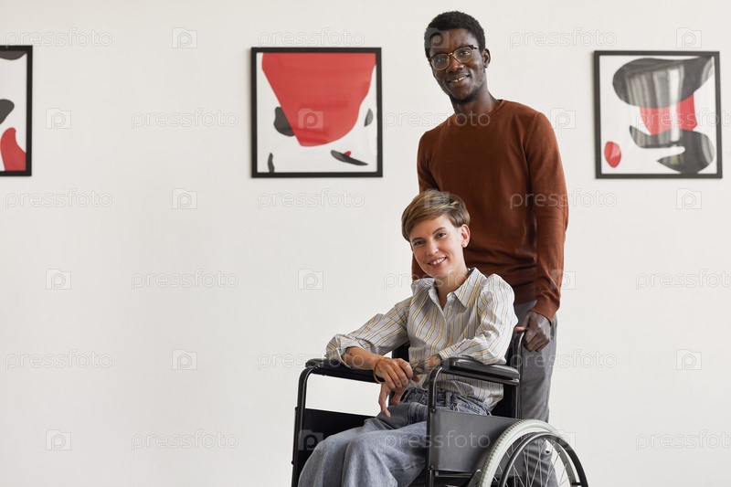 Женщина-инвалид посещает художественный музей с опекуном