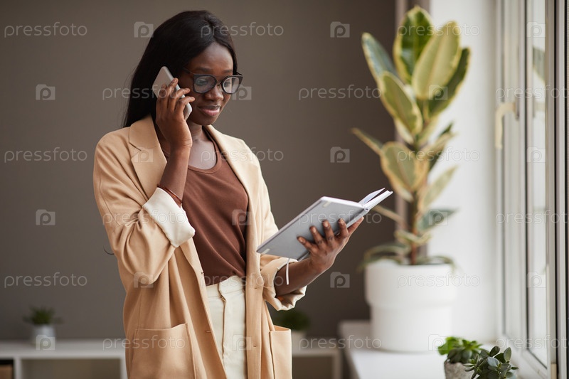 Успешная афроамериканская женщина говорит со смартфона