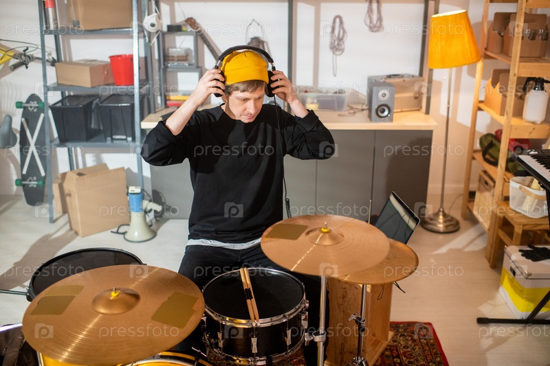 Современный молодой музыкант в повседневной одежде надевает наушники перед репетицией