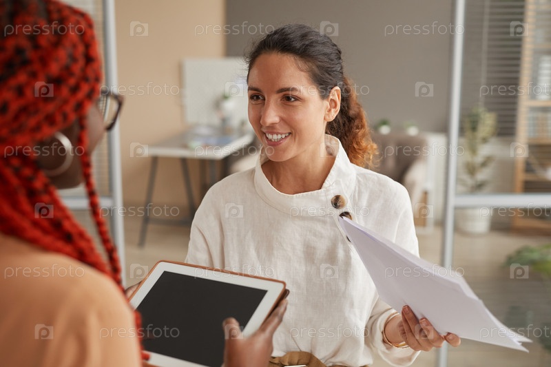 Успешная бизнесвумен разговаривает со своим сотрудником