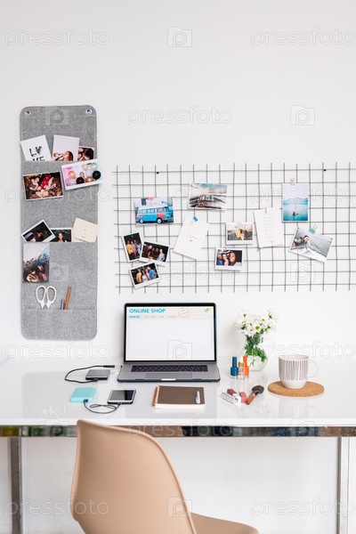 Стул за столом с гаджетами, косметическими средствами, блокнотом, кружкой и цветами