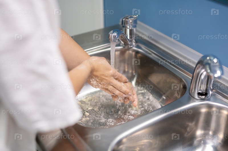 Молодой ассистент или хирург в белом униформе моет руки после операции