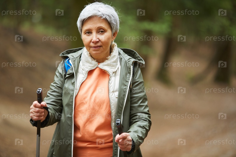 Активная зрелая женщина наслаждается походом в лесу