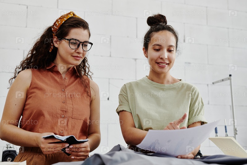 Довольно креативная женщина показывает своему коллеге модный эскиз на встрече