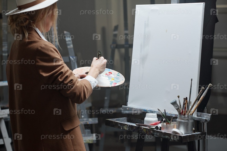 Молодая современная женщина с цветовой палитрой смешивает цвета, прежде чем рисовать