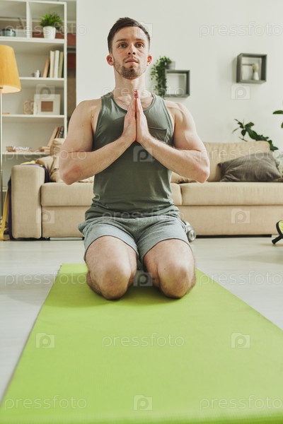 Расслабленный мужчина с объединенными руками близко к груди, практикующий йогу