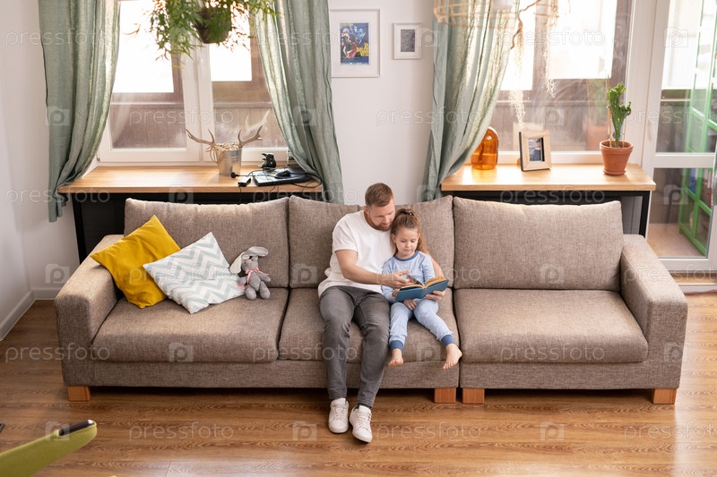 Молодой отец и его милая дочка сидят на диване, читая книгу