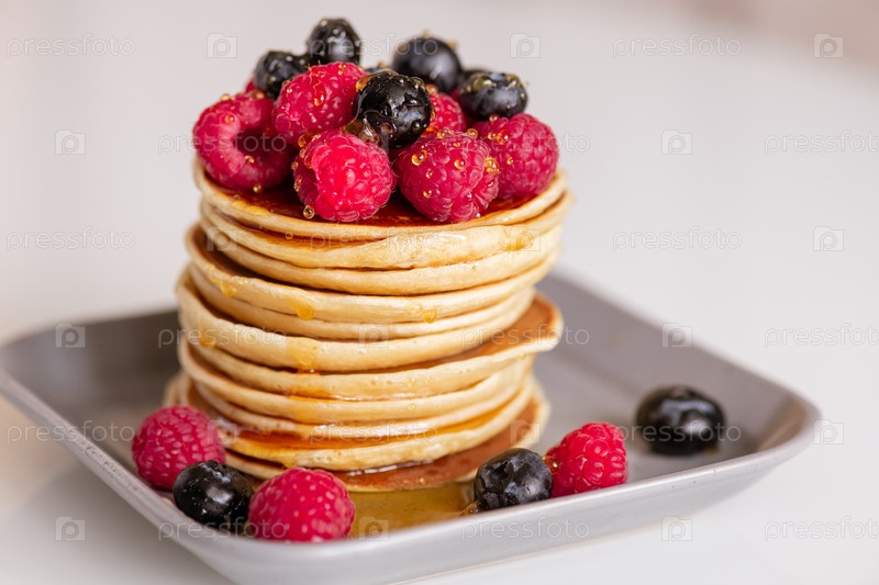 Серая квадратная тарелка с кучей аппетитных и вкусных домашних блинов
