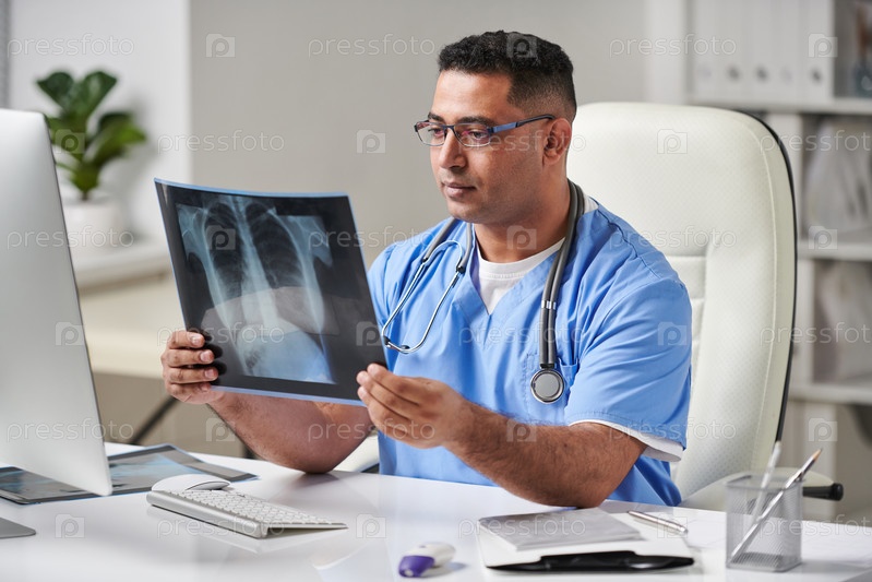 Горизонтальный средний портретный снимок современного врача Ближнего Востока в синей форме, сидящего за столом в офисе и смотрящего на рентген