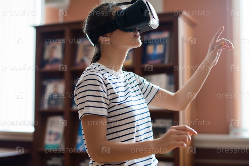 Современный студент-подросток с VR гарнитурой, указывающей на виртуальный дисплей