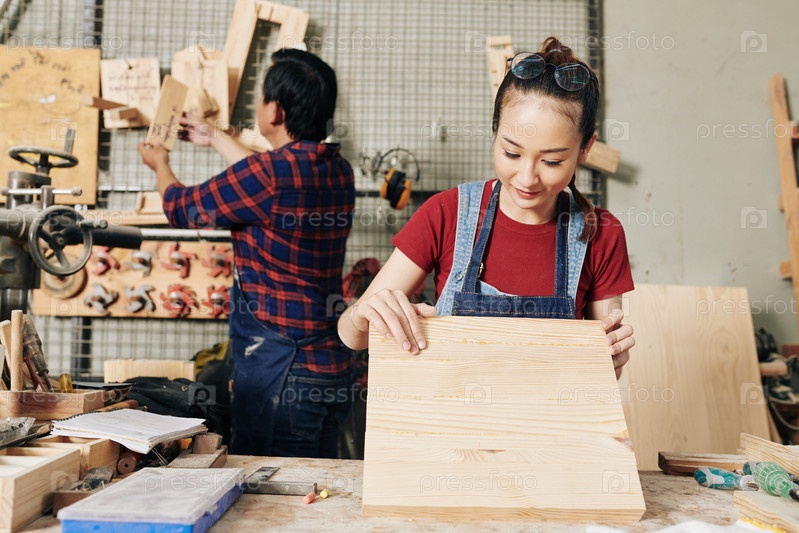 Плотник выбирает деревянную доску