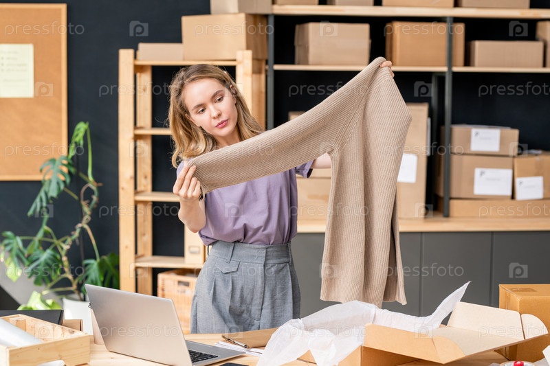 Молодая управляющая интернет-магазином, которая смотрит на трикотажный свитер