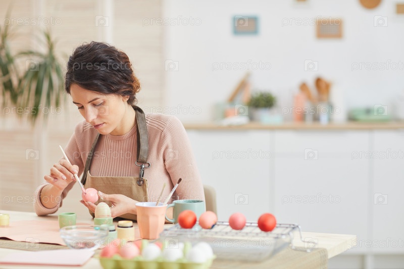 Молодая женщина рукой рисует пасхальные яйца