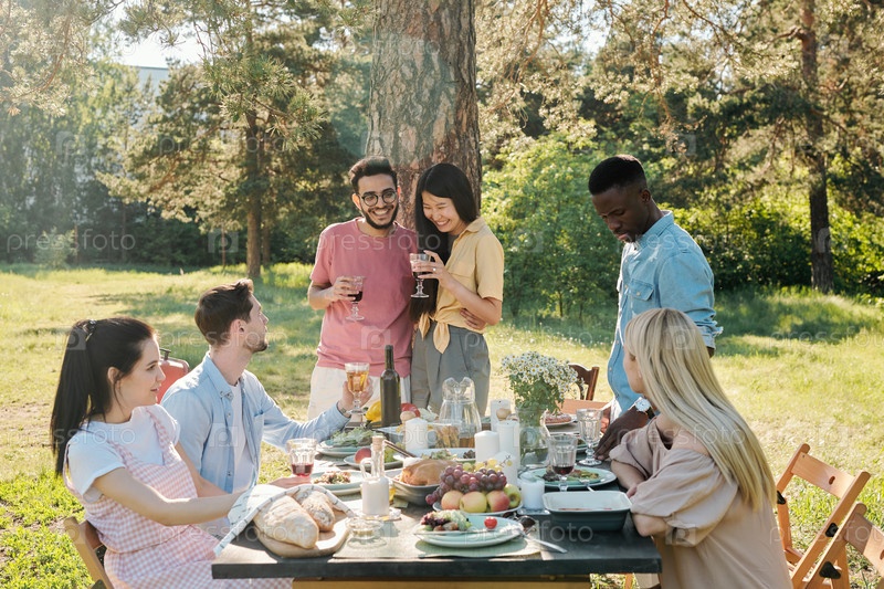 Счастливая молодая межкультурная пара со стаканами вина, тостирующая у ствола дерева