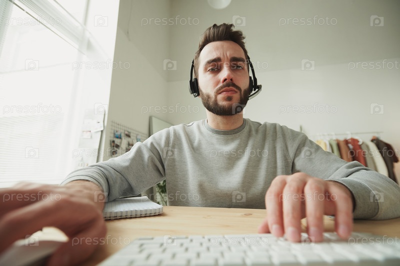 Серьезный оператор с гарнитурой смотрит на дисплей ноутбука, сидя за столом
