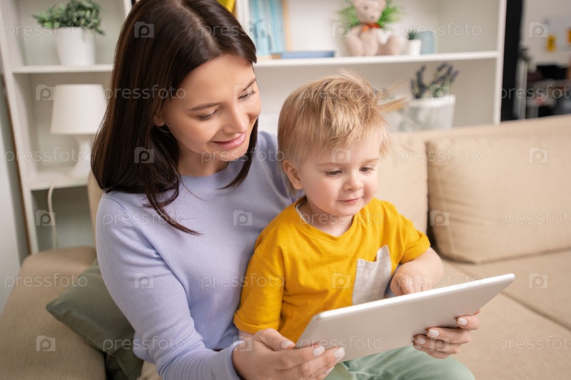 Счастливая молодая мать и милый маленький сын смотрят на фотографии в планшете