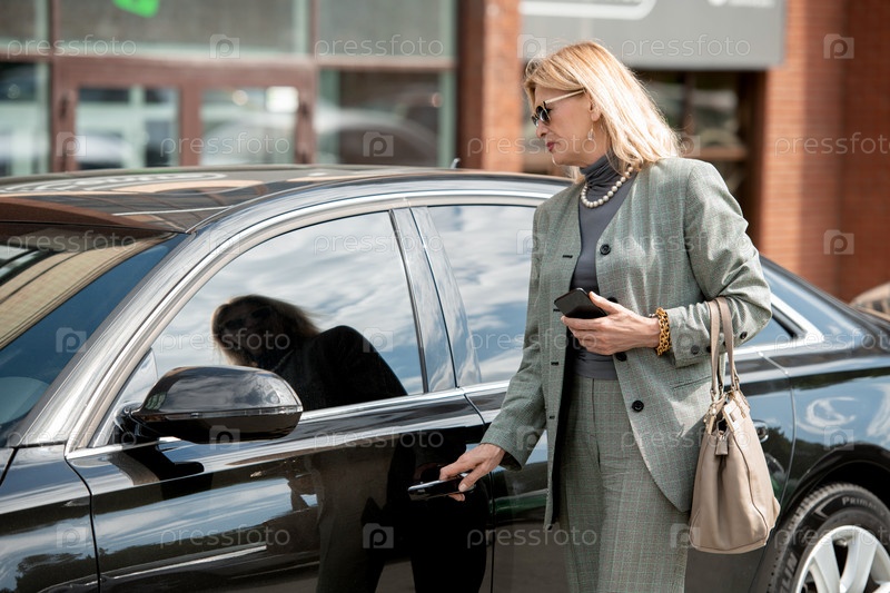 Элегантная зрелая деловая женщина в солнцезащитных очках и сером костюме стоит рядом с черной машиной