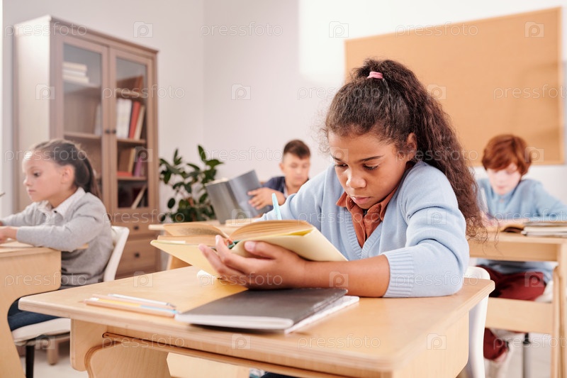 Умная милая школьница читает книги и делает заметки у стола в классе